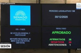 El proyecto de la Interrupción Legal del Embarazo finalmente fue aprobado este miércoles por el Senado en una sesión maratónica, con 38 votos a favor, 29 en contra, una abstención y cuatro ausencias.